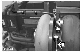 15 在沃爾沃渦輪增壓器中加注新的、干凈的發動機機油并用新密封件安裝供油管(1)。用夾子將管線固定到發動機吊眼上。用新密封件安裝新冷卻劑連接(2)。