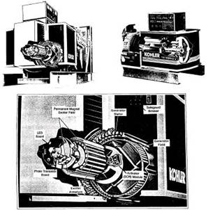 LED裝在發電機軸的端部,對著在軸上旋轉的光敏晶體管。光敏晶體管接收來自LED的信號,按要求比如調壓器的指令來指示SCR旋轉橋開通或關斷。