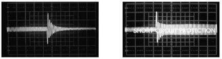 耐受短路電流能力 一臺工作在滿負荷下的發電機組3相對稱短路——最嚴重的情況——顯示在兩示波器屏幕上。左邊的軌跡顯示工作在額定電流下的常規無刷發電機在短路時,由沖擊電流逐漸減少至低于額定電流。右邊屏幕上的軌跡顯示的是額定值一樣的快速響應Ⅱ發電機,工作在同樣情況下,其電流升高至超出其額定水平,從而能夠跳開支路斷路器。