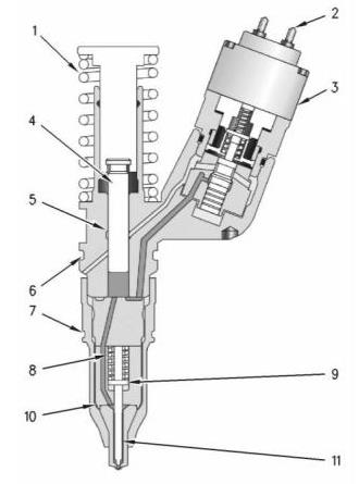 當電子單體噴油器機構將力傳遞到電子單體噴油器的頂部時,彈簧(1)被壓縮,柱塞(4)向下驅動。此操作通過電磁閥總成(3)中的閥將燃油置換到燃油箱的回油歧管中。當柱塞向下移動時,缸筒(5)中的油道被柱塞的外徑封閉。閥體(10)內和沿單向閥(11)至噴油器尖端的油道中已經含有用于噴射的燃油。當柱塞缸中的油道關閉后,噴油器隨時準備噴射。噴射的開始依賴于電子控制模塊(ECM)中的軟件。
