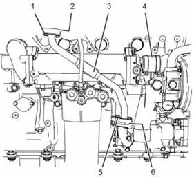5. 將發(fā)動機機油冷卻器(9)放置在發(fā)動機機油濾清器底座上。