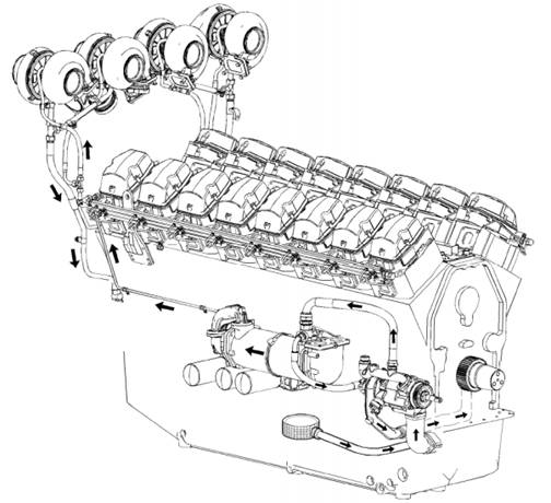 Perkins4016柴油發(fā)動(dòng)機(jī)機(jī)油通過A排由齒輪驅(qū)動(dòng)的機(jī)油泵輸送,流過網(wǎng)狀粗濾器。機(jī)油泵將機(jī)油送至可調(diào)節(jié)安全閥。安全閥允許過多的機(jī)油通過發(fā)動(dòng)機(jī)曲軸箱的門流回發(fā)動(dòng)機(jī)油底殼,以保持正確的工作壓力。輸送的機(jī)油通過機(jī)油管在A排和B排之間分流。機(jī)油管穿過發(fā)動(dòng)機(jī)油底殼的內(nèi)部。接著,部分機(jī)油流過每排的單個(gè)機(jī)油濾清器。此后機(jī)油流向發(fā)動(dòng)機(jī)曲軸箱內(nèi)用于、A卻活塞的油道。