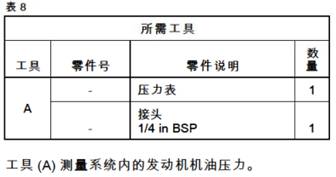 注:發動機機油壓力的記錄可用作發動機可能出現問題或發生損壞的指示。發動機機油壓力突然變化70 kPa (10 poI)可能表明存在故障。拉查發動機并排除故障。