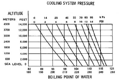 沸點受三種因素影響:壓力,海拔和冷卻液中的乙二醇濃度。液體沸點隨著壓力增加而增加。液體沸點隨著海拔高度增加而降低。圖39顯示壓力和海拔對水的沸點的影響。