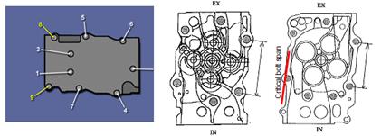 康明斯Cummins QSK23發動機有7條螺栓擰緊缸蓋的燃燒室區域。這使得氣缸能密封200 Bar壓力并將缸套扭曲維持在最小。兩個小一點的缸蓋螺栓用于密封推桿腔。