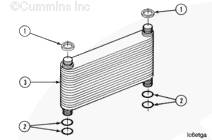 從康明斯QSK45 發動機上拆下 3 個機油冷卻器芯 (2) 或從 QSK60 發動機上拆下 4 個機油冷卻器芯 (2)。從每個冷卻器芯 (2) 上拆下 4 個 O 形密封圈 (1),并將其廢棄。