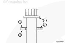 注: K38 發動機上使用了兩種不同長度的缸蓋螺栓。發動機生產序號 (ESN) 大于 33101470 的發動機和所有維修用缸體上使用長度為 203 mm [8 in] 的螺栓。ESN 小于 33101470 的發動機上使用長度為 170 mm [6.75 in] 的螺栓。 K50 發動機上使用的螺栓(黑色)長度為 203 mm [8 in]。