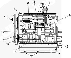 1排氣歧管,2渦輪增壓器機油進口,3渦輪增壓器,4節溫器殼通風口,5節溫器殼,6發動機冷卻液出口,7冷卻液溫度傳感器,8水泵,9冷卻液濾清器,10發動機放油口,11組合式全流/旁通機油濾清器,12機油冷卻器,13飛輪殼,14發動機生產序號(ESN),15渦輪增壓器機油回油口。