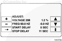 設(shè)置和調(diào)整子菜單允許標(biāo)定圖形顯示器上的計量儀表,并可以調(diào)整系統(tǒng)參數(shù)和用戶定義的故障代碼、發(fā)電機組的電壓/頻率以及并聯(lián)應(yīng)用類型。設(shè)置和調(diào)整子菜單只能由合格的技術(shù)人員進(jìn)行修改。