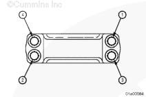 用清潔的 15W-40 機油潤滑連桿螺栓的螺紋和墊圈。安裝連桿蓋、螺栓和墊圈。先用手?jǐn)Q緊所有螺栓。