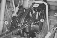 安裝145-5191千分表支架在氣門蓋底端的螺絲孔(2). 調整在氣門過橋( 4 )上端的接觸表面( 3 ).