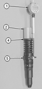 瞬間按住預設按鈕以便停止數字式千分表上的“P”在千分表右上角閃動. 此時顯示屏幕會顯示87.00 mm. 將1U-8869千分表和9U-5233磁性固定裝置擺放在單體泵上正確的位置. 確保磁性底座的磁性固定裝置放在單體泵上的推桿上(4)而加長桿坐在單體泵的杠(5)上端平面.