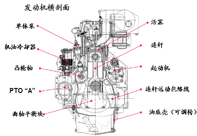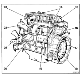 14 升降點(diǎn),15曲軸箱呼吸閥,16 調(diào)速器,17 SAE護(hù)蓋,18調(diào)速輪,19 啟動(dòng)馬達(dá),20 廢氣渦輪增壓器,21鼓風(fēng)機(jī),22 排氣總管,23進(jìn)氣口總管,