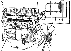 1.節溫器室,2.冷卻液泵,3.機油散熱器,4.氣缸的冷卻,5.缸蓋的冷卻,6.散熱器,7.節溫器到補液箱的回路,8.補液箱到節溫器的回路