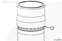 通過康明斯ISX15 CM2250發動機缸套下部外徑上加工出的條帶 (1) 可以輕易識別出工廠墊片調整缸套。安裝缸套后,同樣可以看到此條帶。這些缸套在中間限位座合區域還包含有固定式硬化黃銅墊片 (2)。