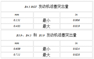 如果康明斯B3.9、B4.5、B4.5 RGT 和 B5.9 發動機活塞突出量不符合技術規范,核實是否安裝了正確的零件,和/或缸體燃燒面是否機加工不當。參考步驟 001-026。