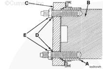 將安裝工具 (C) 的擴(kuò)孔端置于雙頭螺釘上,并且與承磨襯套對準(zhǔn),與曲軸端垂直。將墊圈(D)和螺母(E)安裝到螺紋雙頭螺釘上。