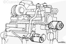排放康明斯發動機冷卻液。參考第 8 節中的步驟 008-018(冷卻系統)。