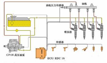 • 燃油共軌系統(tǒng)中的高壓油泵CP1H的進(jìn)油計量比例閥安裝在進(jìn)油油路前端,用于調(diào)節(jié)高壓油泵的進(jìn)油量,高壓油泵僅僅給共軌管道中提供必要的高壓燃油量。這樣設(shè)計既可以提高工作效率,又可以減少對燃油的加熱。