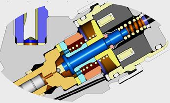 當(dāng)噴油器的電磁閥被觸發(fā),泄油孔被打開,這引起控制腔的壓力下降,結(jié)果,活塞上的液壓力也隨之下降,一旦液壓力降至低于作用于噴油嘴針閥承壓面上的力,針閥被打開,燃油經(jīng)噴孔噴入燃燒室。這種對噴油嘴針閥的不直接控制采用了一套液壓力放大系統(tǒng),因為快速打開針閥所需的力不能直接由電磁閥產(chǎn)生,所謂的打開針閥所需的控制作用,是通過電磁閥打開泄油孔使得控制腔壓力降低,從而打開針閥。